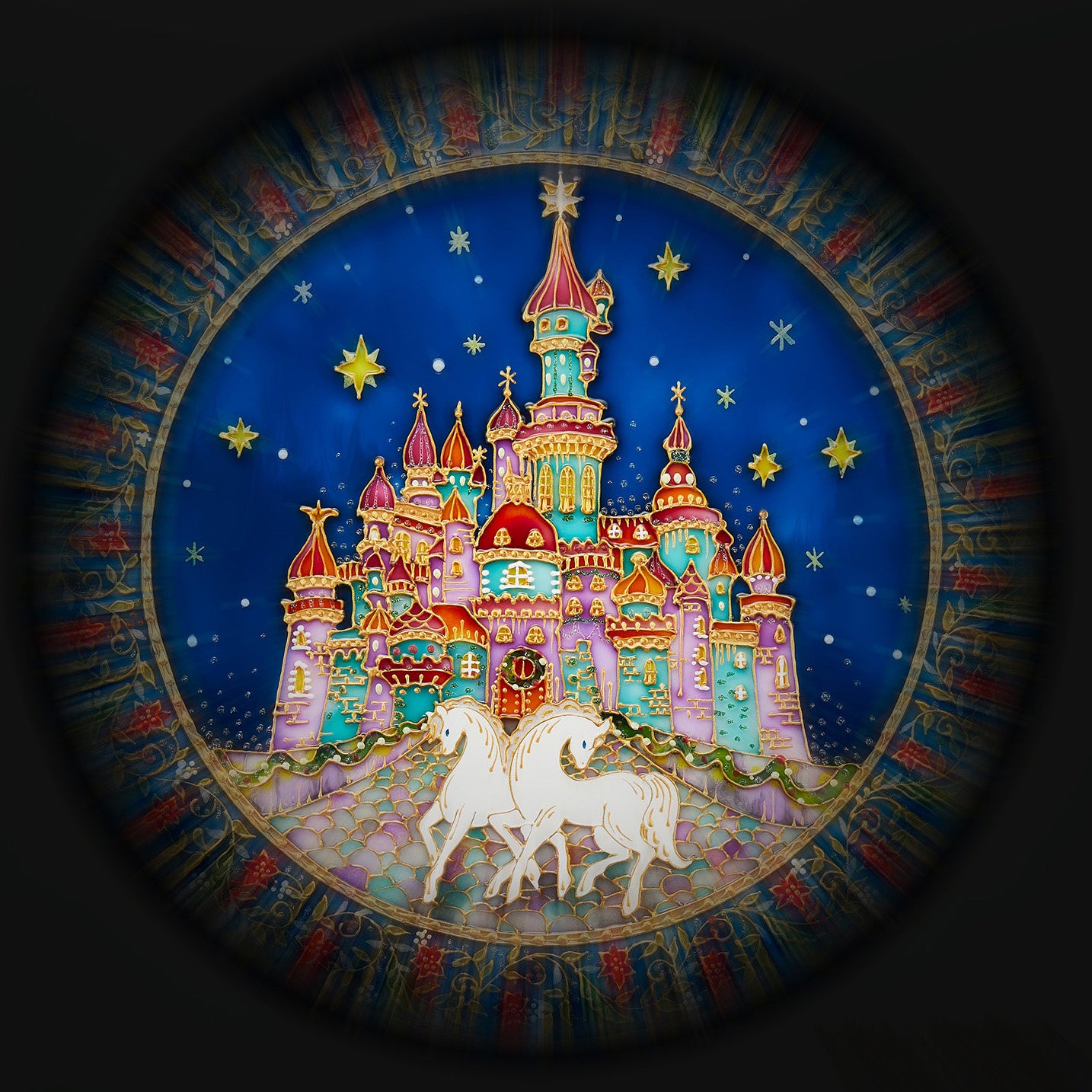 『クリスマス限定お城缶』の蓋面のガラス絵