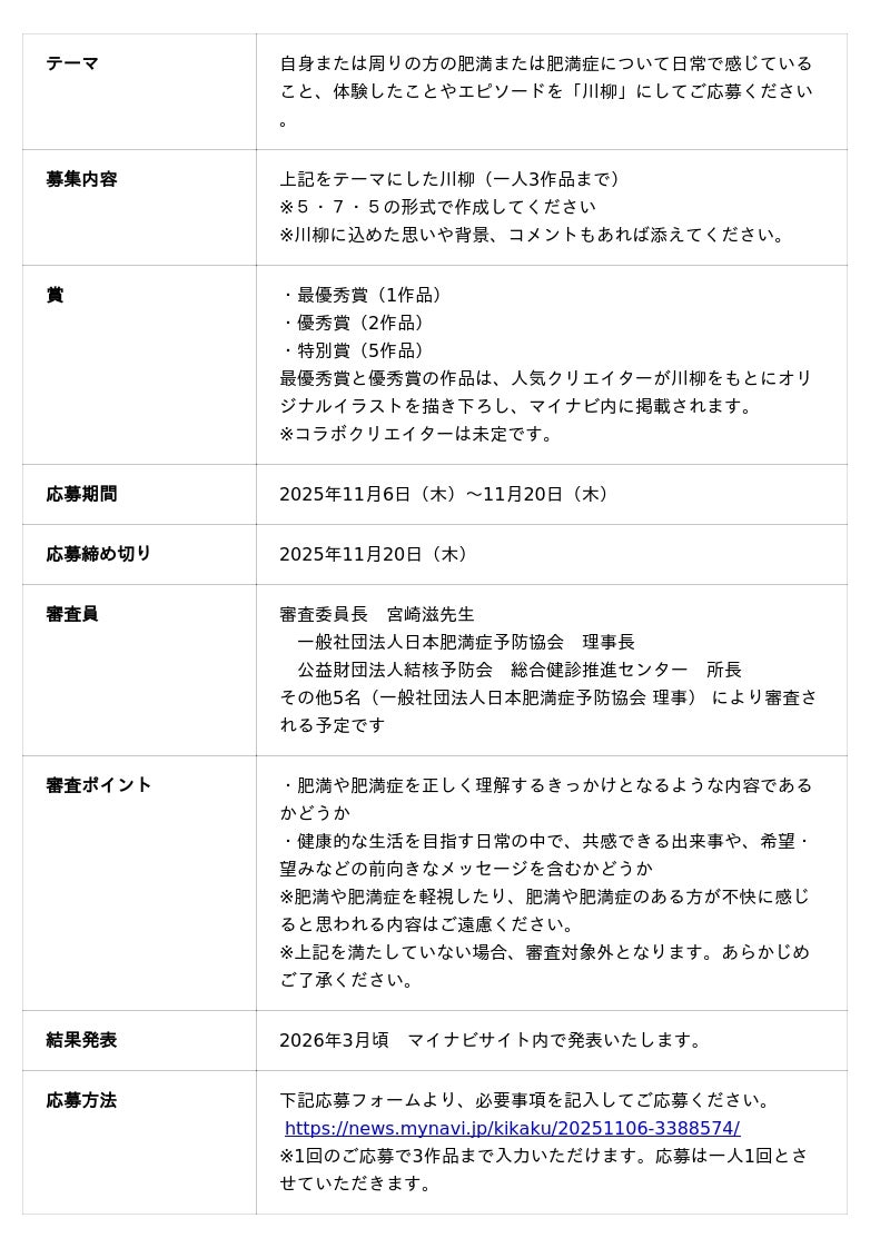 日本イーライリリー株式会社(本社:兵庫県神戸市、代表取締役社長:シモーネ・トムセン、以下、日本イーライリリー)と田辺三菱製薬株式会社(本社:大阪市中央区、代表取締役CEO:原田明久、以下、田辺三菱製薬)は、肥満症の理解促進を目的として両社が取り組む「その肥満、肥満症かも!」プロジェクトの一環として、“肥満と肥満症の見方を変え、味方になろう!“を合言葉に、「肥満症のただしいミカタ川柳」の募集を開始しました。募集期間は2025年11月6日(木)~11月20日(木)です。