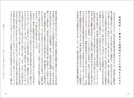 昨今の科学分野では、幼少期の人間関係が脳の健全な発達や知的能力、レジリエンス、さらには生涯にわたる幸福にとってきわめて重要であるという考え方が主流になってきました――。