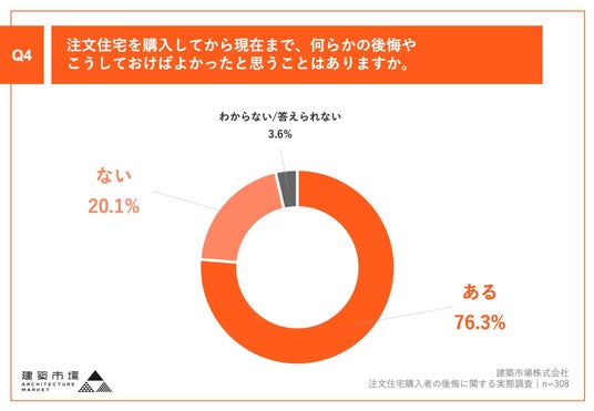 「Q4.注文住宅を購入してから現在まで、何らかの後悔やこうしておけばよかったと思うことはありますか。」(n=308)と質問したところ、「ある」が76.3%、「ない」が20.1%という回答となりました。