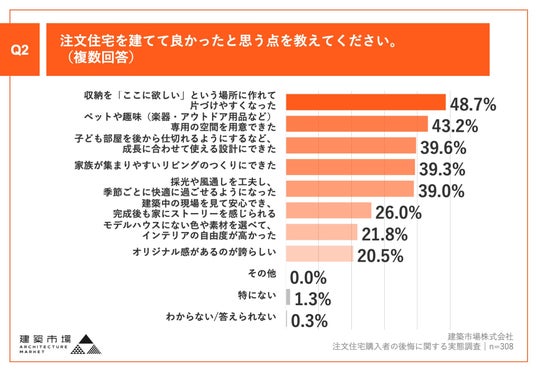 「Q2.注文住宅を建てて良かったと思う点を教えてください。(複数回答)」(n=308)と質問したところ、「収納を「ここに欲しい」という場所に作れて片づけやすくなった」が48.7%、「ペットや趣味(楽器・アウトドア用品など)専用の空間を用意できた」が43.2%、「子ども部屋を後から仕切れるようにするなど、成長に合わせて使える設計にできた」が39.6%という回答となりました。