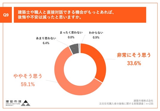 Q4で「ある」と回答した方に、「Q9.建築士や職人と直接対話できる機会がもっとあれば、後悔や不安は減ったと思いますか。」(n=235)と質問したところ、「非常にそう思う」が33.6%、「ややそう思う」が59.1%という回答となりました。