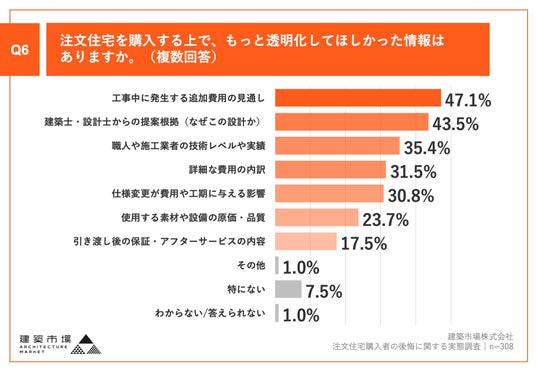 「Q6.注文住宅を購入する上で、もっと透明化してほしかった情報はありますか。(複数回答)」(n=308)と質問したところ、「工事中に発生する追加費用の見通し」が47.1%、「建築士・設計士からの提案根拠(なぜこの設計か)」が43.5%、「職人や施工業者の技術レベルや実績」が35.4%という回答となりました。