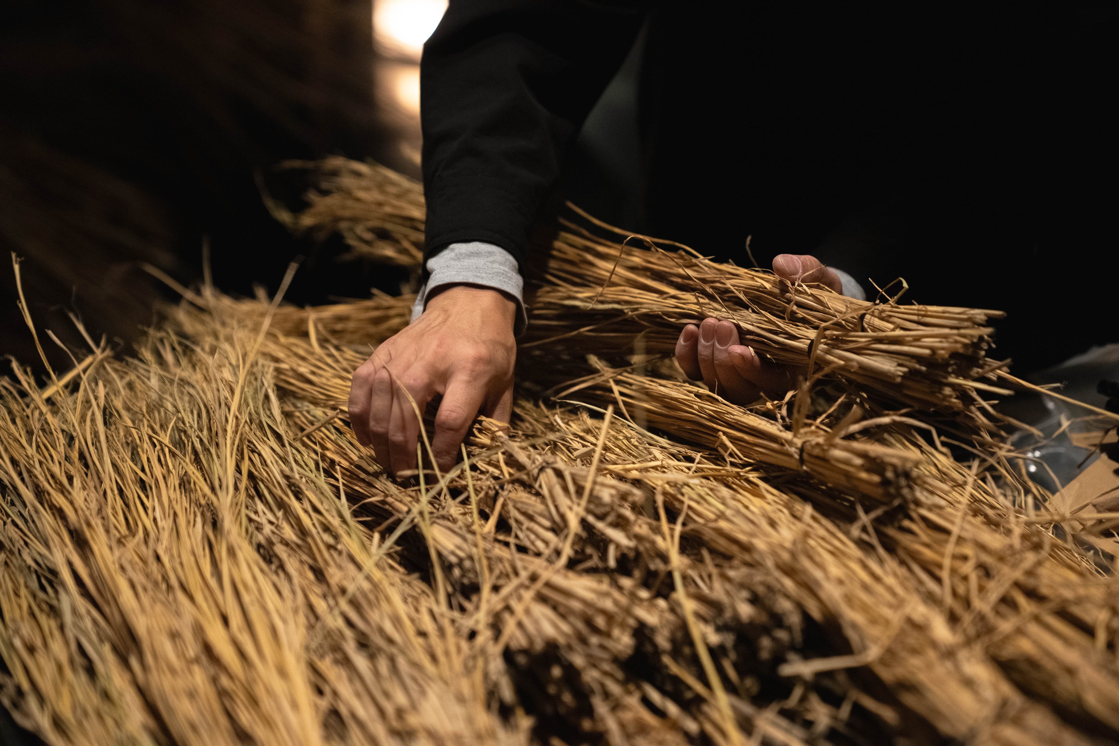 大阪がかつて米どころとして栄えた歴史に着想を得て、豊穣の象徴である「米」の稲わらを素材として採用。秋の収穫を終え、本来であれば処分される稲わらに新たな命を吹き込み、クリスマスツリーとして甦らせました。さらにクリスマス期間が終わると、稲わらは新年を迎える「しめ縄」などへと姿を変え、もう一度生まれ変わります。季節とともに形を変えながら命をつないでいく、循環型の装飾です。