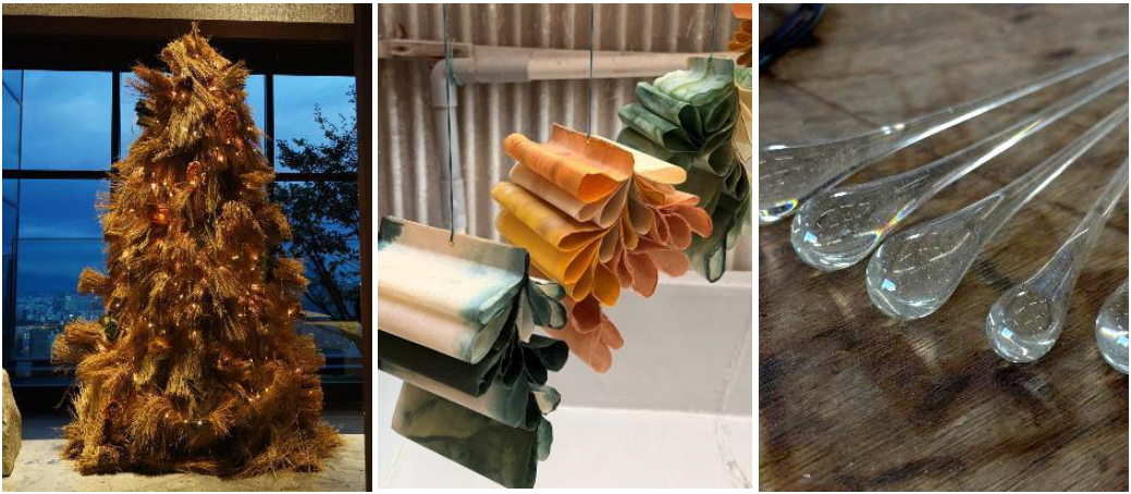 オーナメントには、手すき和紙や再生ガラスなど、サステナブルな素材を採用しています。千年以上受け継がれる日本の伝統工芸である手すき和紙は、再生可能な植物を原料に、職人が一枚ずつ丁寧に漉き上げることで、やわらかく温かみのある風合いを生み、ツリー全体を優しく包み込みます。また、使用済みガラスや製造過程で生じたガラスくずを再利用した再生ガラスのオーナメントは、光と調和しながら柔らかな輝きを放ちます。