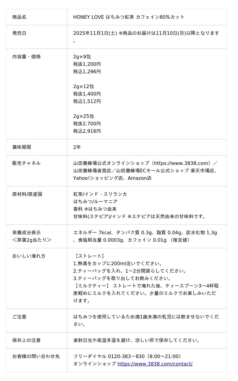 株式会社山田養蜂場(所在地:岡山県苫田郡鏡野町、代表取締役社長:山田英生)は、「HONEY LOVE はちみつ紅茶 カフェイン80%カット」を2025年11月1日に新発売いたします。