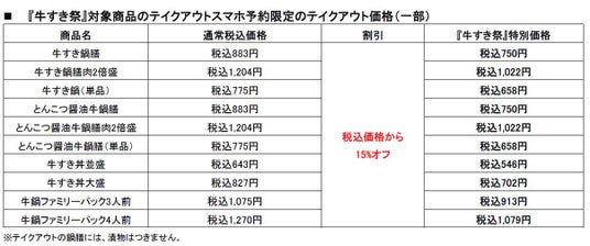 『牛すき祭』期間中は、吉野家公式サイトおよび吉野家公式アプリで利用できる「テイクアウトスマホ予約」をご利用いただくと、対象商品を税込価格から15%オフでご購入いただけます。スマートフォンから簡単にご注文いただける便利なサービスで、店舗での待ち時間なくお受け取りが可能です。