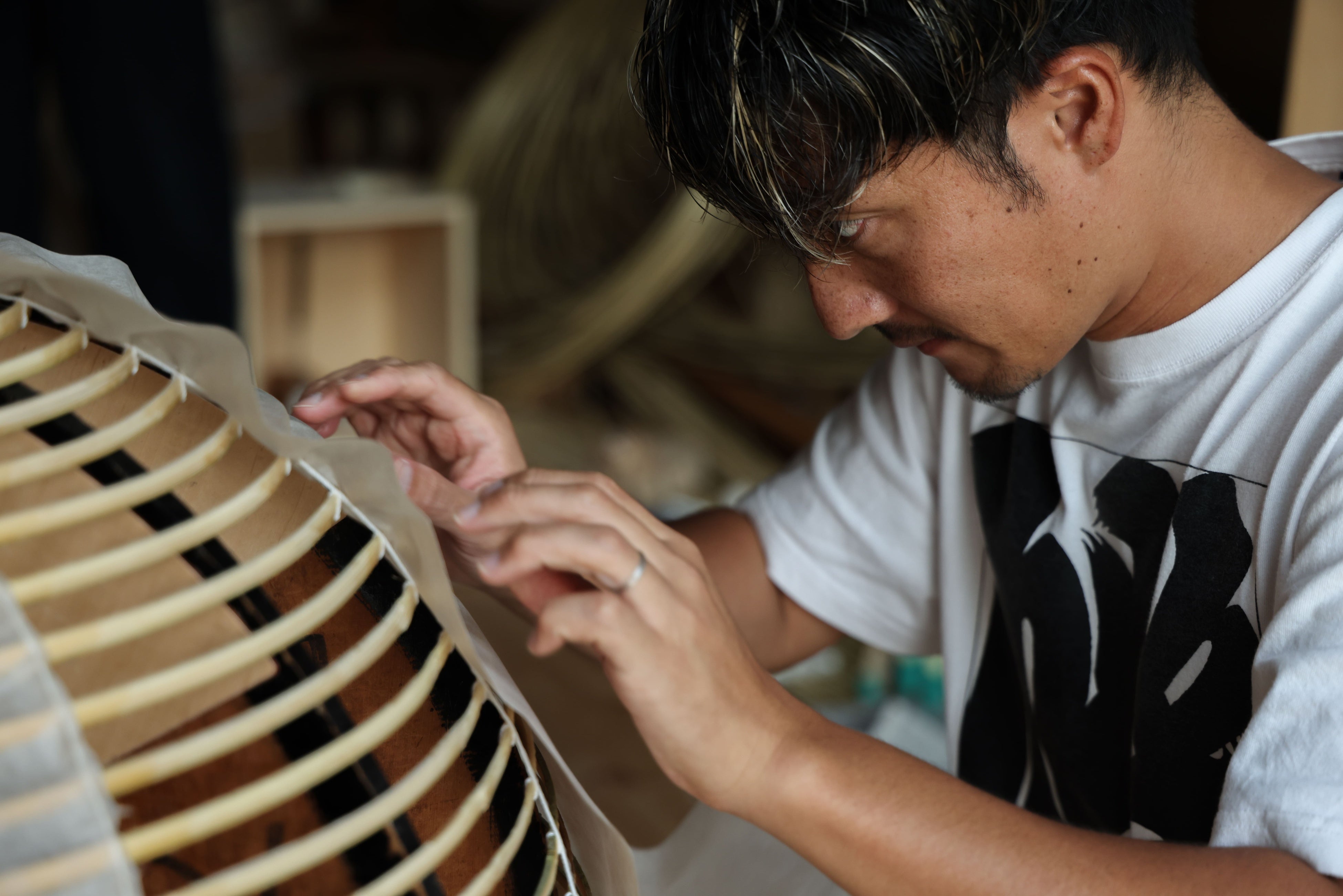 以来、竹割から骨組み、紙貼りまで一貫して手作業で行う「地張り式」製法を守り続け、独立した竹骨を一本ずつ輪にして麻糸でまつることで、強度と柔らかな風合いを両立しています。その無骨で頑丈な「京提灯」は、時代を越えて受け継がれる職人技の象徴。