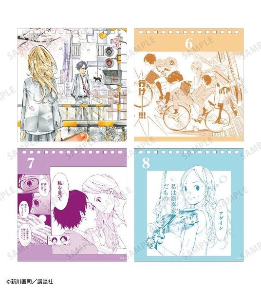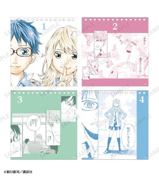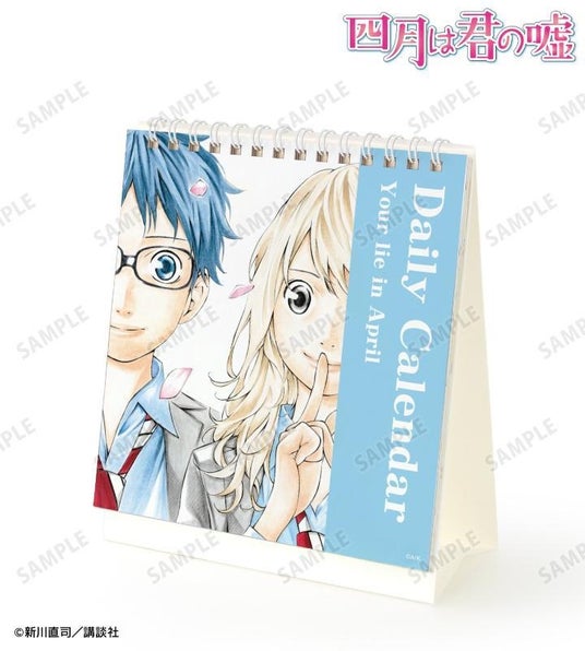 有馬公生、宮園かをり、澤部椿、渡亮太、相座武士、井川絵見、相座凪の原作コマイラストを日替わりでお楽しみいただける日めくりカレンダーに仕上げました。