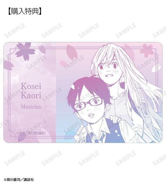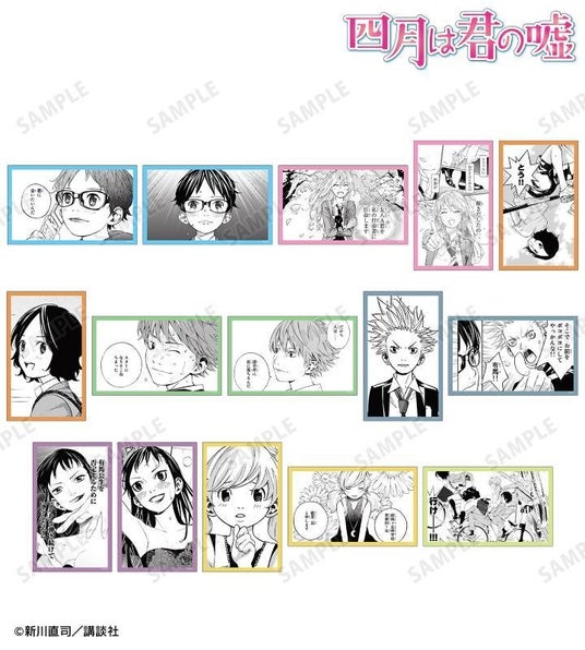 有馬公生、宮園かをり、澤部椿、渡亮太、相座武士、井川絵見、相座凪の原作コマイラストをプラスチックカードに仕上げました。