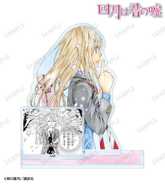 有馬公生、宮園かをり、澤部椿、渡亮太のカラーイラスト、原作コマイラストをパーツ付きのBIGなアクリルスタンドに仕上げました。