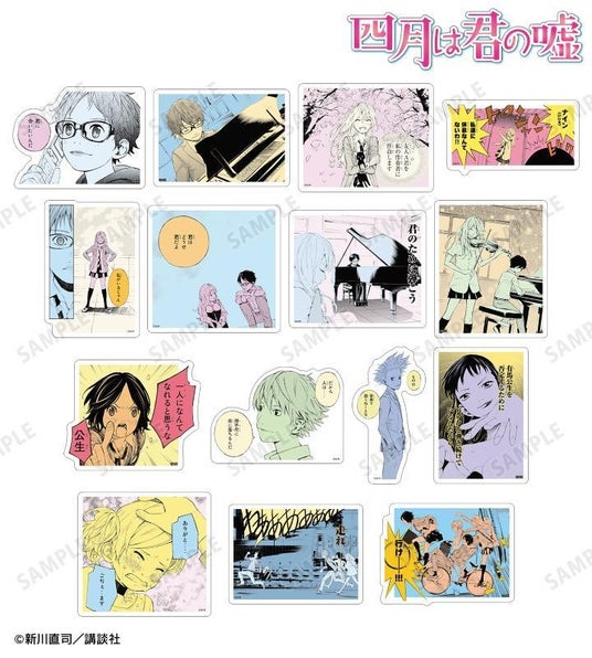 有馬公生、宮園かをり、澤部椿、渡亮太、相座武士、井川絵見、相座凪の原作コマイラストをダイカットのステッカーに仕上げました。
