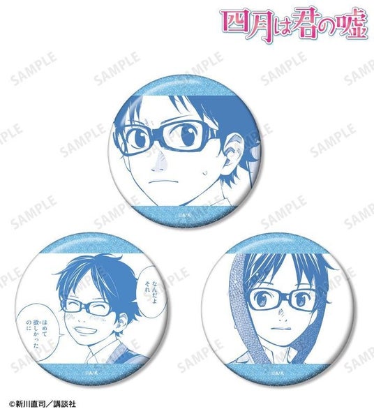 有馬公生、宮園かをり、澤部椿、渡亮太、相座武士、井川絵見、相座凪の原作コマイラストをグリッター加工を施した缶バッジ3個セットに仕上げました。