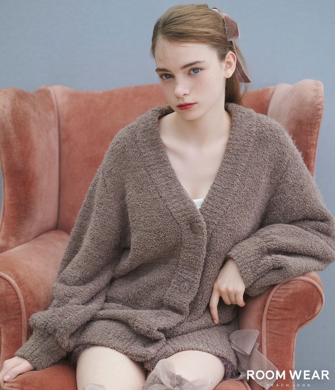 毛足が長く、ふわふわと地厚であたたかなフェザーヤーンニットを使用したフェザーヤーンリボンカーディガンパジャマは、カーディガン+ショートパンツの2点セット。華奢見え&脚長見え効果で、映え度抜群のルームスタイルが楽しむことができます。