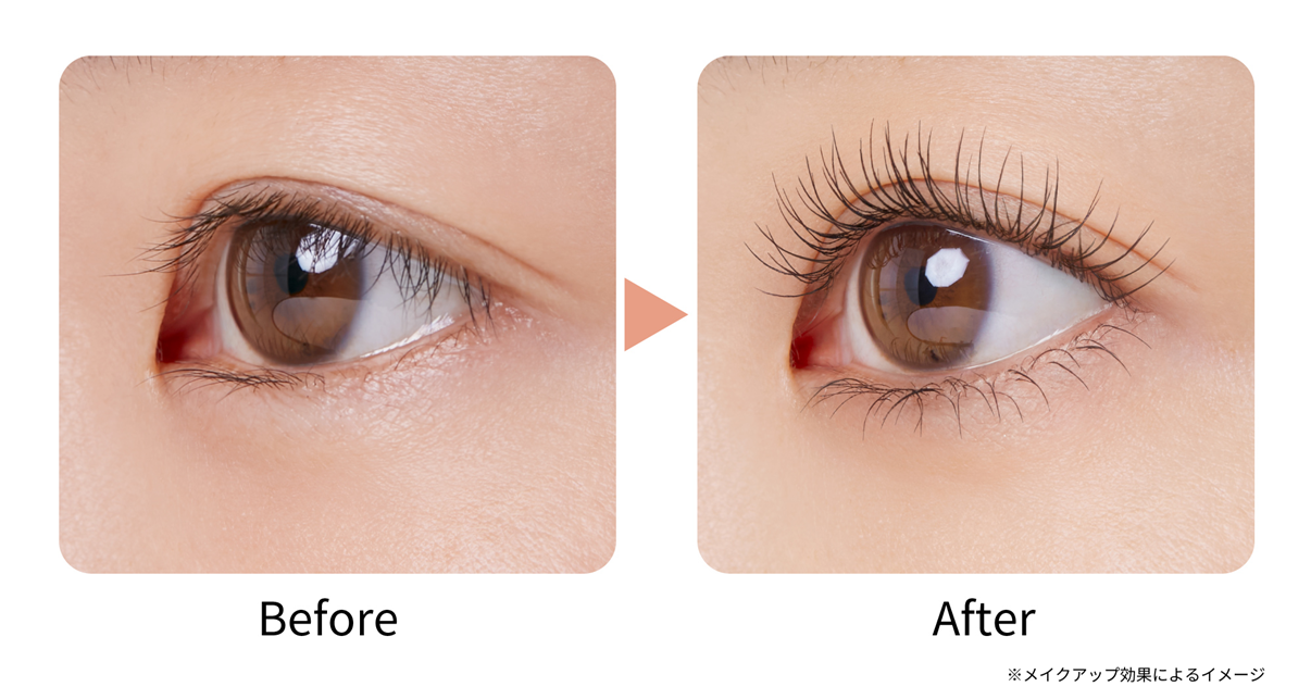 仕上がりの秘密は、長短2種のブラック繊維と、まつ毛をしっかりさばいて伸ばす「エクステンションコーム」。長さだけでなく、まつ毛の本数も増えたような、ふさふさとしたやわらかな仕上がりで、上向きカールを長時間キープします。