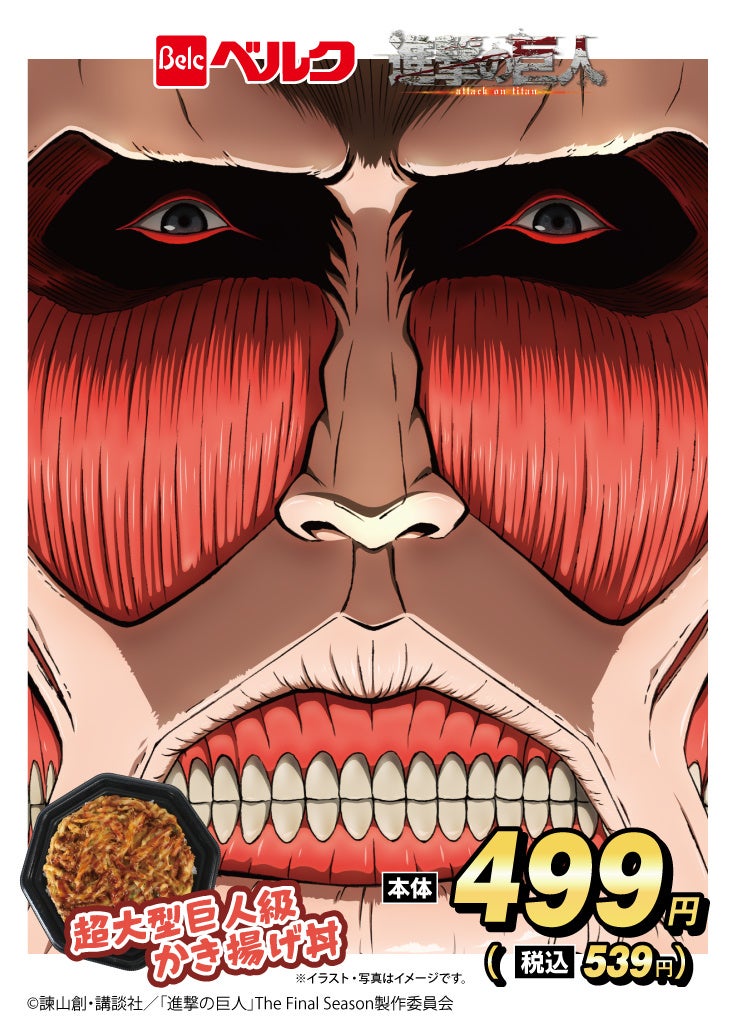 11月6日(木)よりベルク各店(CLBE店舗除く)にてコラボ3商品(「心臓を捧げよ!鶏ハツブロッコリー」「巨人の小指(実寸?)メンチカツ」「超大型巨人級 かき揚げ丼」)を期間限定で販売いたします。TVアニメ『進撃の巨人』の世界観をぜひお楽しみください。■心臓を捧げよ!鶏ハツブロッコリー
