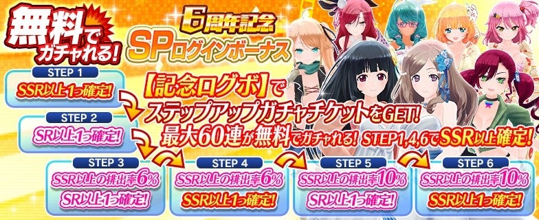 1)無料ステップアップガチャチケットがもらえる、6周年記念SPログインボーナス