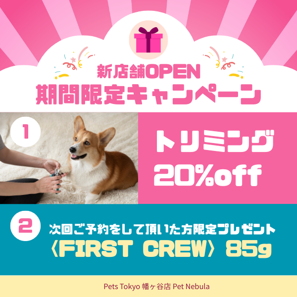 Pets Tokyo 幡ヶ谷店 Pet Nebulaでは、オープンを記念してトリミング20%offキャンペーンを実施中。さらに、次回のご予約をして頂いた方限定で、次回ご来店時に〈FIRST CREW〉85gをプレゼントいたします。