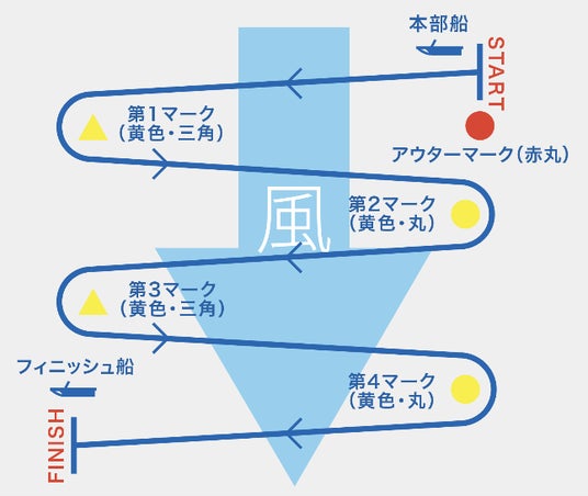風上側のスタートラインから、風下側に設定されたいくつかのマークを回り、スピードを競いながらゴールを目指します。スピード感溢れるレース展開になり、特に最初のマーキングは大きく順位を左右するため、激しいバトルや駆け引きが展開されます。最も速くコースを走り抜けた者が一番であるという単純な判りやすさもスラロームの魅力です。