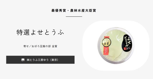 2年連続、史上初の3冠!農林水産大臣賞に、(株)とうふ工房ゆう(東京都青梅市)の「特選よせとうふ」、農林水産省大臣官房長賞に、(有)村のおっさん(徳島県名東郡)、むさし屋豆腐店(東京都練馬区)がダブル受賞!