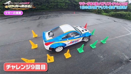 まずはゆっくりと動きの確認を行い、「油圧サイドブレーキ」を引くタイミングをチェック。1回目の挑戦では、最後の「ドリフト駐車」でパイロン(目印)に直撃してしまいますが、動きの形は掴めており、下田さんからは「赤いパイロン(目印)に対して車の左側を合わせる」など、より具体的なアドバイスが送られました。そのアドバイスの効果は絶大で、マギーの動きはどんどん洗練されていき、あと一歩で成功という状態に。そして迎えた9回目のチャレンジでコツを掴んだマギーは、見事「ドリフト駐車」を成功させました。