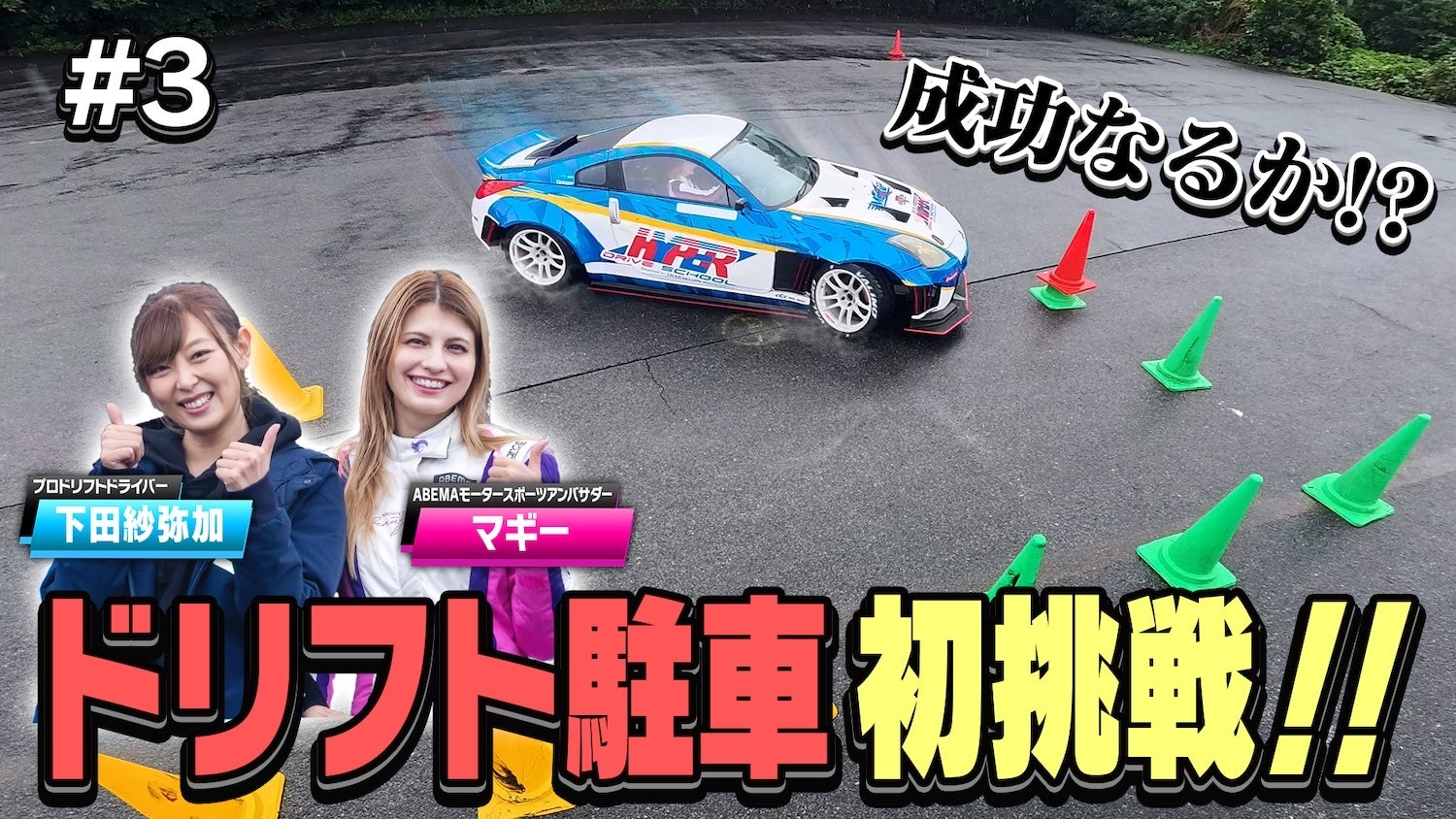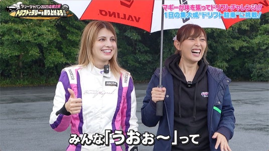 第3弾では、マギーが「ドリフト駐車」に挑戦。講師を務めるプロドリフトドライバーの下田紗弥加さんは、「1回目の『定常円ドリフト5周』も、2回目の『8の字ドリフト3周』もスムーズに終わっちゃったんですよ…そんなに簡単にできないんですよ。今回もうまくいっちゃいそう」「今回は新しい武器を使います」と語り、純正のブレーキより強力でドリフトのきっかけづくりやサイドターンがしやすくなる「油圧サイドブレーキ」を使用することを明かしました。マギーは「絶対に成功させてみせます」と意気込みを口にします。