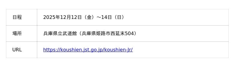 JST(理事長 橋本 和仁)は、科学好きの裾野を広げるとともに、次世代の科学技術・イノベーションの創出を担う優れた人材の育成を目的として、全国の中学生が都道府県を代表して科学の力を競う「第13回科学の甲子園ジュニア全国大会」を2025年12月12日(金)から12月14日(日)まで、兵庫県姫路市で開催します。このたび、出場する全都道府県の代表チームが決定しました。