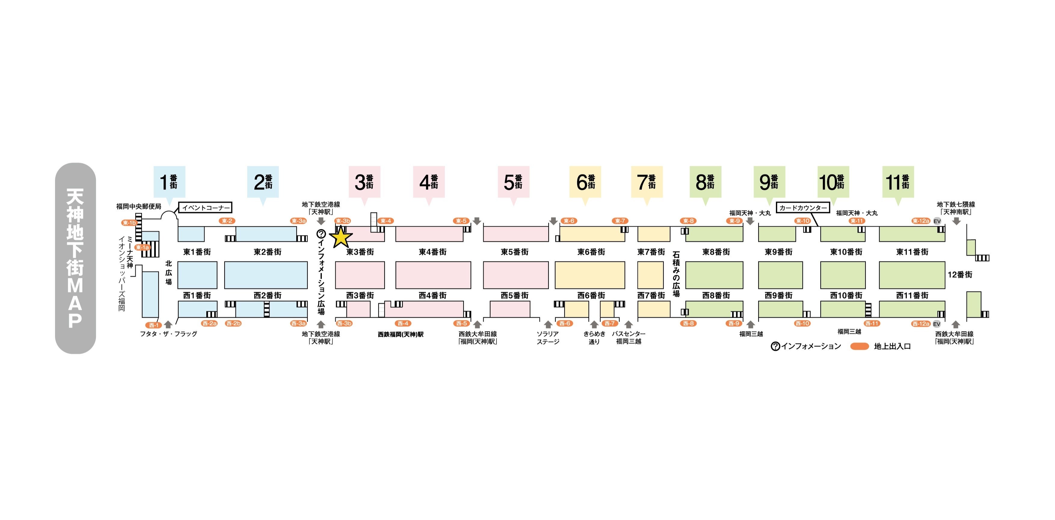 所在地:福岡市中央区天神2丁目地下1・2・3号九州最大の繁華街天神の地下を南北に貫く全長約590mの地下街。通称「てんちか」。