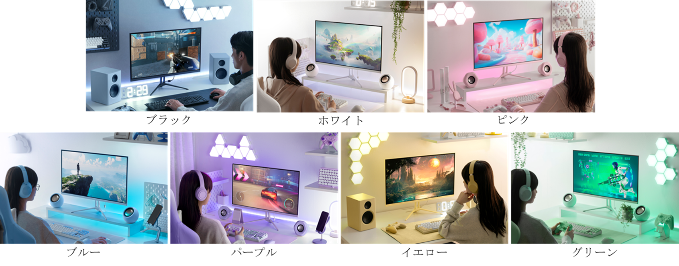 今回発売する「LUCA ゲーミングモニター」23.8インチ・27インチは、7色(ブラック、ホワイト、ピンク、ブルー、パープル、イエロー、グリーン)の豊富なカラーバリエーションを用意しているため「推しカラー」を選べ、自身の個性やインテリアの雰囲気に合わせて自分好みのゲーム空間を構築できます。