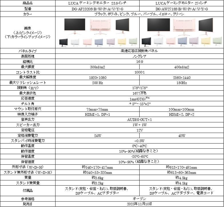アイリスオーヤマ株式会社(本社:宮城県仙台市、代表取締役社長:大山 晃弘)は、当社初となるゲーミングモニターシリーズ「LUCA ゲーミングモニター」の23.8インチと27インチを2025年11月10 日より、インターネット通販サイトを中心に順次発売いたします(※1)。