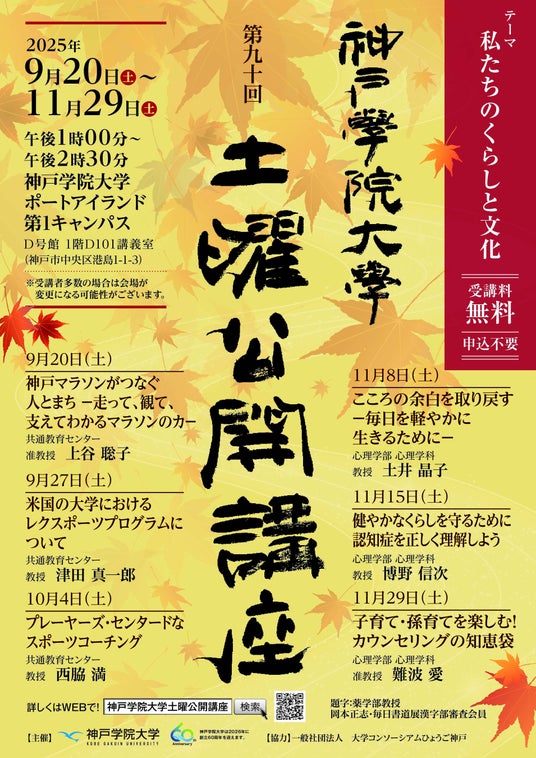 地域に開かれた知の交流「土曜公開講座」を約半世紀にわたり開催神戸学院大学は、「真理愛好・個性尊重」の建学の精神に基づき、大学の研究・教育の成果を地域社会へ還元することを目的に、1976年から「土曜公開講座」を開講しています。第1回から数えて90回目となる今回は、「私たちのくらしと文化」をメインテーマとし、各学部の教員が専門領域から現代社会の関心の高いテーマを取り上げます。詳細はこちら