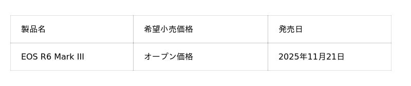 キヤノンは、高い静止画撮影性能と充実の動画撮影機能を搭載したフルサイズミラーレスカメラ“EOS R6 Mark III”を2025年11月21日に発売します。静止画メインのユーザーから、静止画・動画の両方に高い性能を求めるユーザーまで、幅広いハイアマチュアユーザーのニーズに応えます。