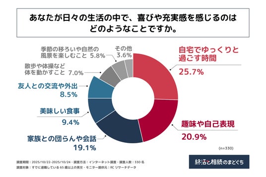 日々の生活の中で喜びや充実感を感じることのトップ3は、1位「自宅でゆっくりと過ごす時間」、2位「趣味や自己表現」、3位「家族との団らんや会話」