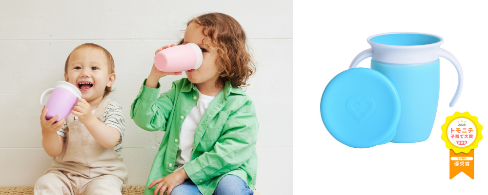 世界中の家族へ愛があふれる楽しいグッズを!ロサンゼルス発のポップなカラーとミラクルな機能がいっぱいのマンチキン。日本国内のシリーズ累計出荷数150万個突破※!「ミラクルカップ」は“もうこぼさない!”がキャッチコピーの、逆さにしてもこぼれにくいコップ。くちびるで挟んだところだけ飲み物が出るから、普通のコップのように飲めるのに洋服もテーブルも車も汚しません。