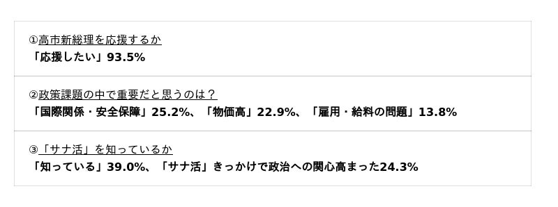 また、「サナ活」がきっかけで政治への関心が高まったかどうかについては、「あまり変わらない」が47.5%、「少し高まった」が25.8%、「高まった」が24.3%となりました。