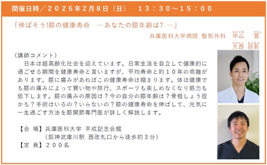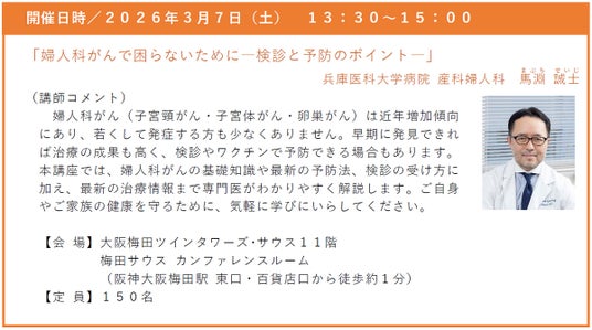 さらに、12月・2026年2月の会場(大阪梅田ツインタワーズ・サウス 11階・梅田サウス カンファレンスルーム)では、兵庫医科大学 梅田健康医学クリニックによる“超音波検査”の体験コーナーを、2026年1月・3月の会場(兵庫医科大学 平成記念会館)では、株式会社ウエルネス阪神による”健康測定”の体験コーナーを出展します。
