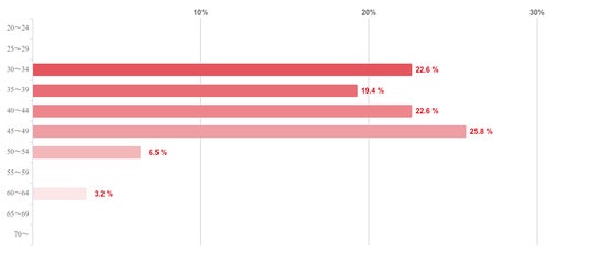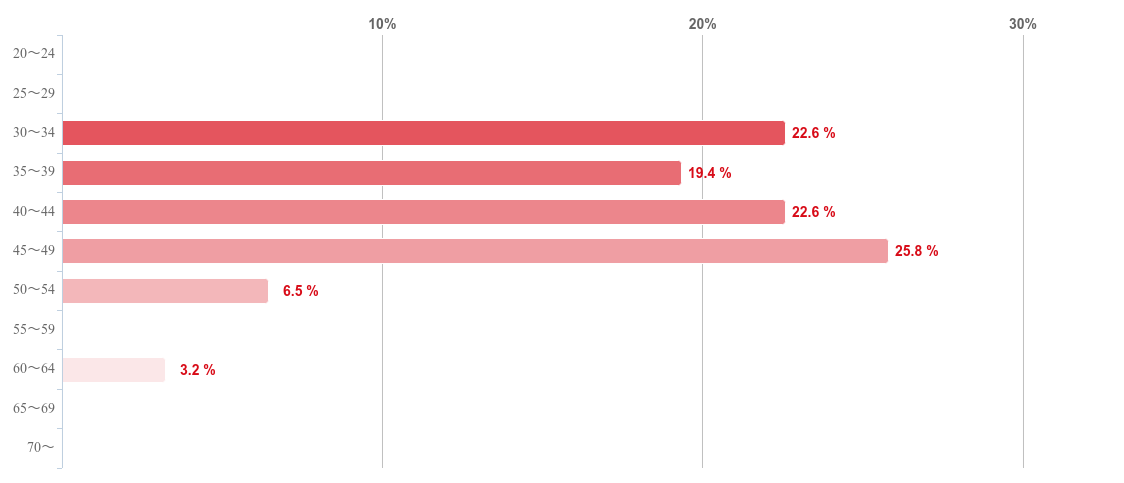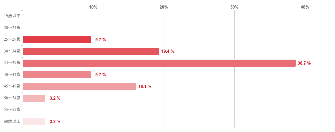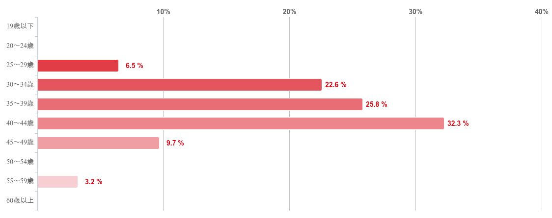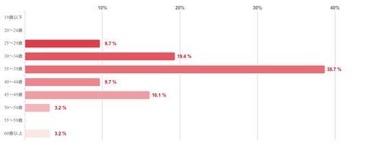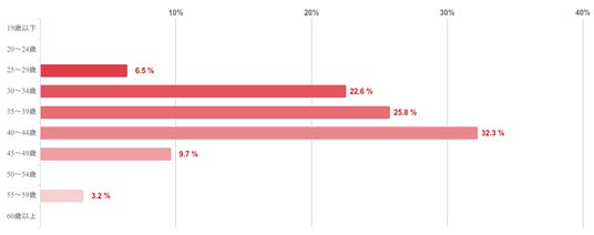 「40~44歳」と回答した人が32.3%で最も多く、次いで「35~39歳」(25.8%)、「30~34歳」(22.6%)という順となった。