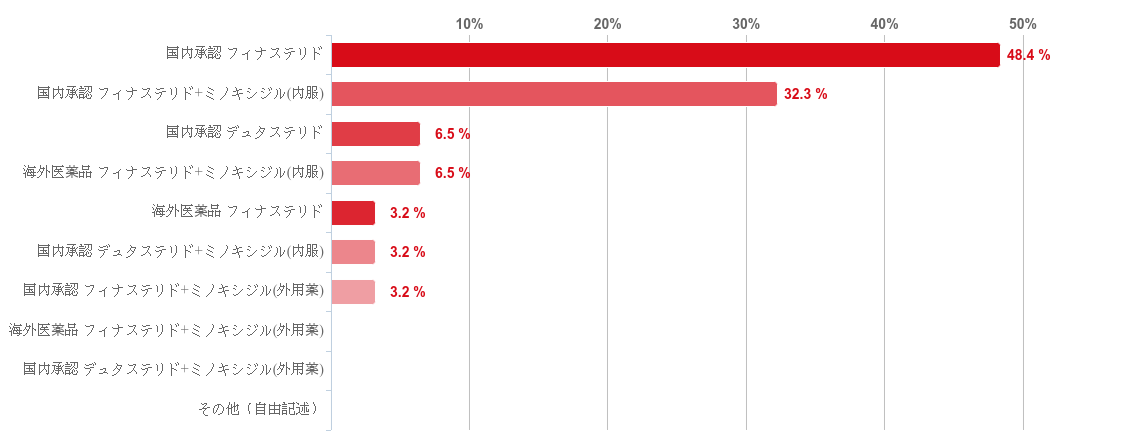「国内承認 フィナステリド」と回答した人が48.4%、次いで「国内承認 フィナステリド+ミノキシジル(内服)」が32.3%で続き、この二つの回答が多い結果となった。