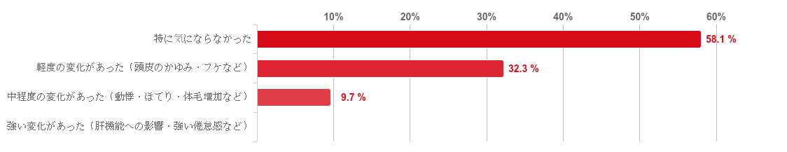 そのほか、「軽度の変化があった(頭皮のかゆみ・フケなど)」と回答した人は32.3%、「中程度の変化があった(同期・ほてり・体毛増加など)」と回答した人は9.7%と僅かで、「強い変化があった(肝機能への影響・強い倦怠感など)」と回答した人はいなかった。