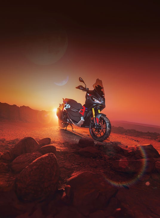 この新型ミドルサイズGTスクーターは、アプリリアのモーターサイクルにおける伝統を体現し、あらゆるルートを走破する新型スクーター。街中では俊敏でレスポンスに優れ、さらにアドベンチャー的なツーリングでも快適で力強い走りを実現。これはまさにアプリリアならではのバイクであり、路面に対して正確なコントロール性を実現する新設計のシャシーを備え、舗装路以外にも十分な走破性を備えます。このマルチな走行性能は、モーターサイクルと同様の構造を持つ高剛性ロングストロークのフロントフォークと、深い溝が刻まれたアドベンチャータイプのタイヤによってもたらされています。SR GT 400のライディングの楽しさは、最新の水冷単気筒エンジンから36馬力を発生し、走行可能な状態での車両重量は186kgで、クラス最高レベルのパワーウェイトレシオに由来しており、5インチTFTディスプレイ、キーレスシステム、ABSや調整が可能なトラクションコントロール、そしてシート下の収納スペースには、フルフェイスヘルメットやその他の荷物を収納でき、5段階の高さに調整可能なウインドスクリーンが標準装備に含まれています。