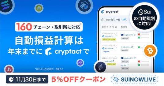仮想通貨(暗号資産)の自動損益計算サービス「クリプタクト」を運営する株式会社pafin(共同代表取締役 アズムデ アミン/斎藤 岳、以下「当社」)は、新しくSuiブロックチェーンの損益計算に対応しました。