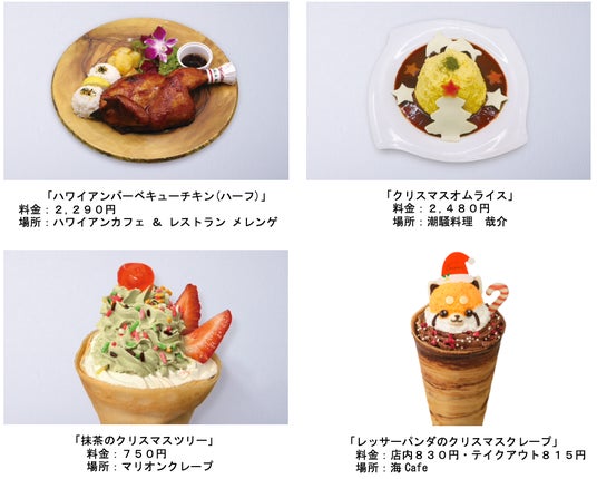 島内のレストランや軽飲食店舗では、クリスマスにぴったりなチキンをはじめ、クリスマスを連想する見た目も可愛らしいクレープなどが登場いたします。見るだけでなく実際に味覚でもクリスマスメニューを堪能しながら、冬のシーパラを存分にお楽しみください。