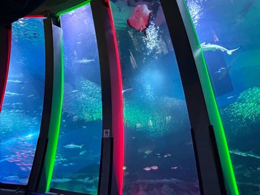 水族館「アクアミュージアム」内の、高さ8m、水量1,500トンの大水槽「大海原に生きる群れと輝きの魚たち」では、国内最多飼育数5万尾のイワシが音楽や照明に合わせ乱舞する幻想的なパフォーマンス「スーパーイワシイリュージョン」を毎日開催しております。
