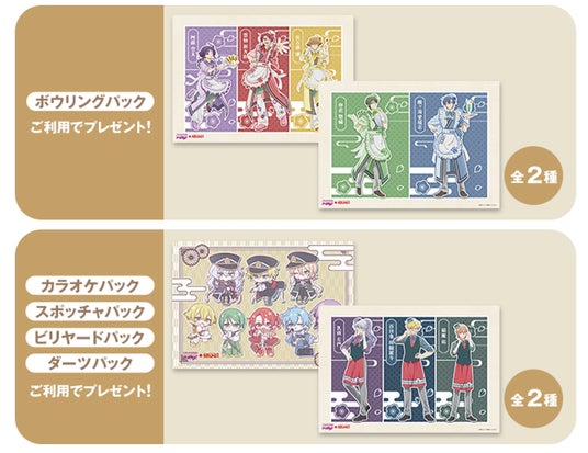 全国のラウンドワンのボウリング96店舗、カラオケ91店舗、ビリヤード46店舗、ダーツ74店舗、スポッチャ53店舗でコラボパックを販売いたします。コラボパックで施設をご利用いただいたお客さまにはオリジナルB4プラマットをプレゼントいたします。前半期間ノベルティデザイン