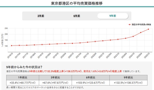 1.マンションナビのデータをもとに、9年前(2016年)の価格推移と比較