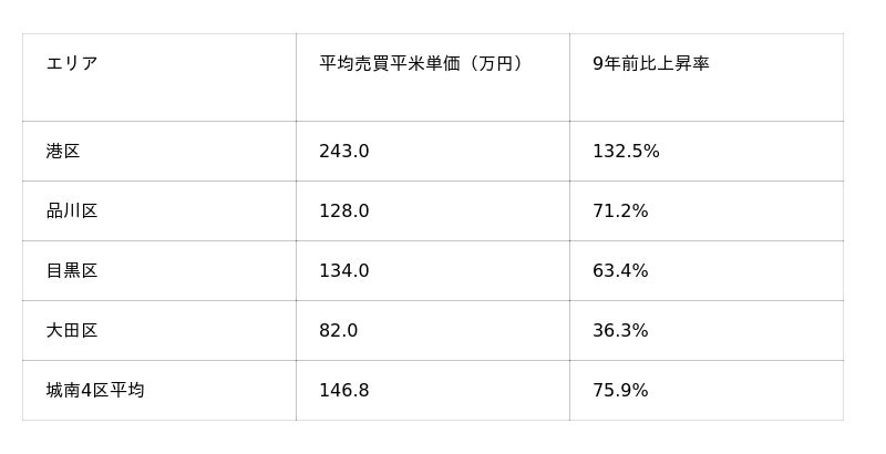 上昇率では港区が突出しており、城南エリア全体の価格水準を押し上げていることが分かります。品川区や目黒区も+60~70%台と高い上昇率を維持しており、城南エリアは超高額エリアに偏らず、広範囲で底堅い相場が形成されています。