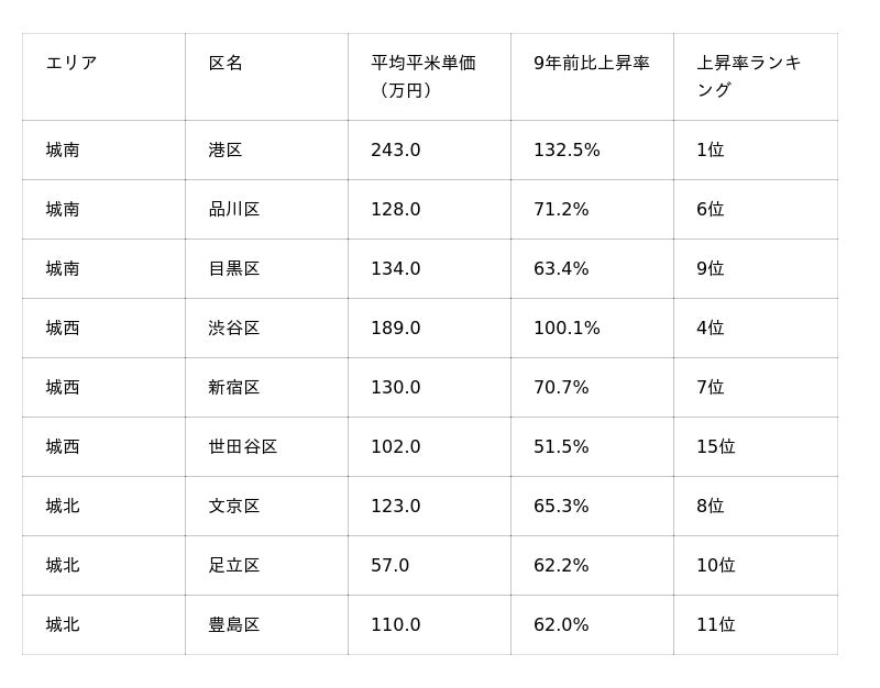 品川区は、9年前と比べて71.2%の上昇率を示し、東京23区全体の上昇率ランキングで6位にランクインしています。平均売買平米単価は128万円です。