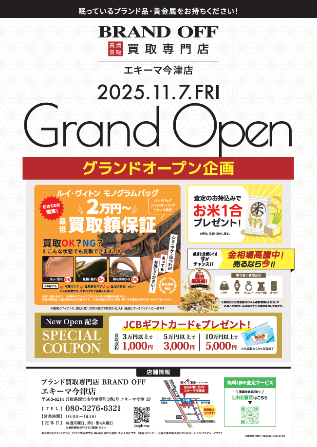 店舗名 :ブランド買取専門店 BRAND OFF エキーマ今津店開業日 :2025年11月7日(金)