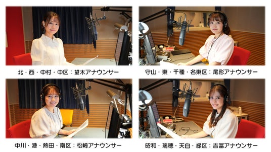 今回の火災予防運動では、メ~テレの熱い地元愛を皆さんに直接お伝えするため地元に飛び出して行く「メ~ロメロ!アンバサダー」を務める、望木聡子・尾形杏奈・松崎杏香・吉冨千鶴の4名のアナウンサーが参加します。4名は名古屋市内を4つのエリアに分担し、名古屋市消防局・消防団の消防車両や、オアシス21をはじめとする市内約20施設で放送される音声アナウンスを担当します。