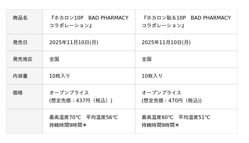株式会社ロッテ(東京都新宿区、代表取締役社長執行役員:中島英樹、以下ロッテ)は2025年11月10日(月)に、BAD PHARMACYメンバーがパッケージデザインを作成した『ホカロン BAD PHARMACYコラボレーション』を発売します。